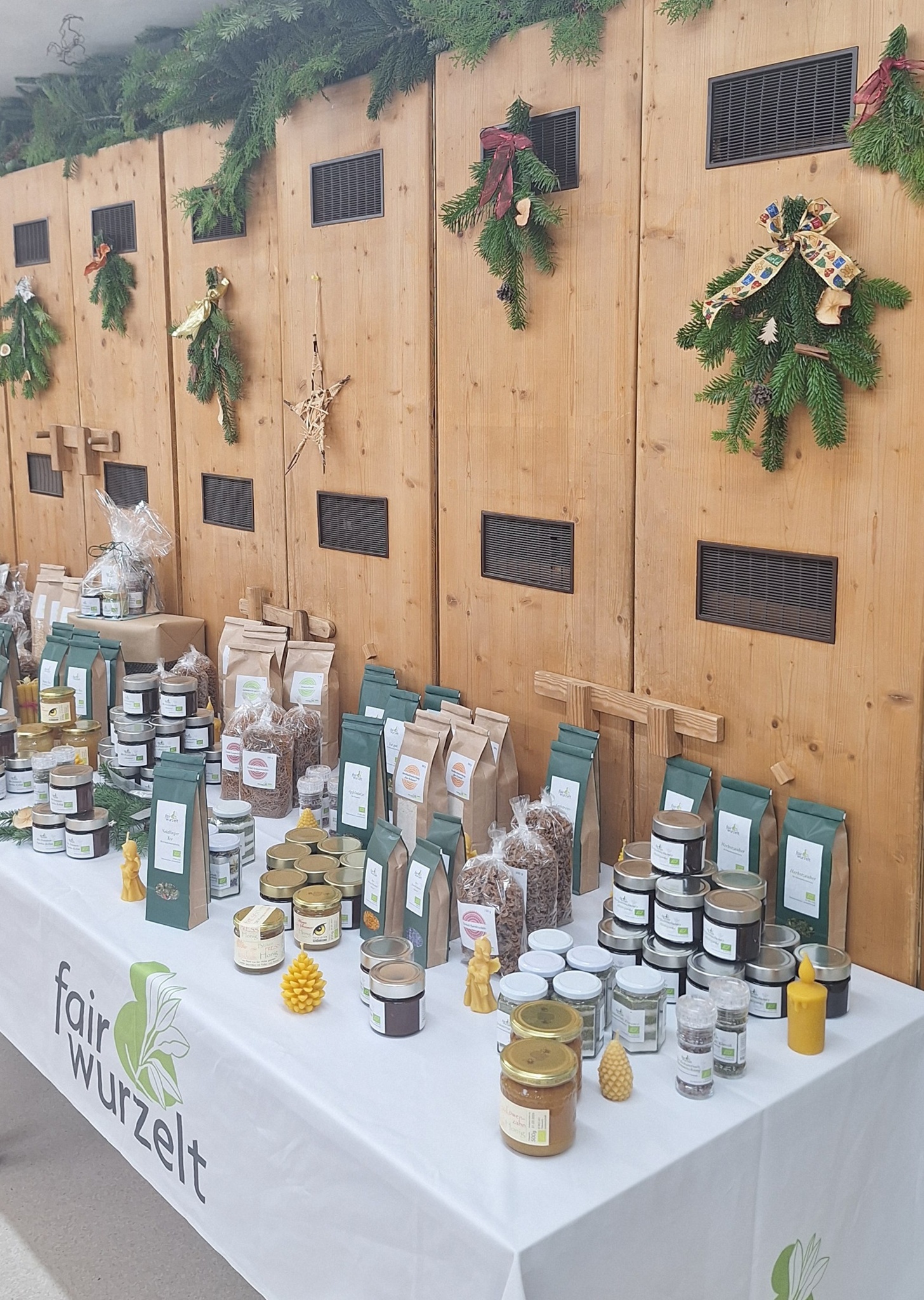 Alle Jahre wieder fand am 1. Adventwochenende der traditionelle Adventmarkt bei fairwurzelt statt. Das weihnachtliche Angebot umfasste wie immer unsere handgeflochtenen Adventkränze, die fairwurzelt Bio-Kräuterprodukte und Produkte anderer Beschäftigungsprojekte.