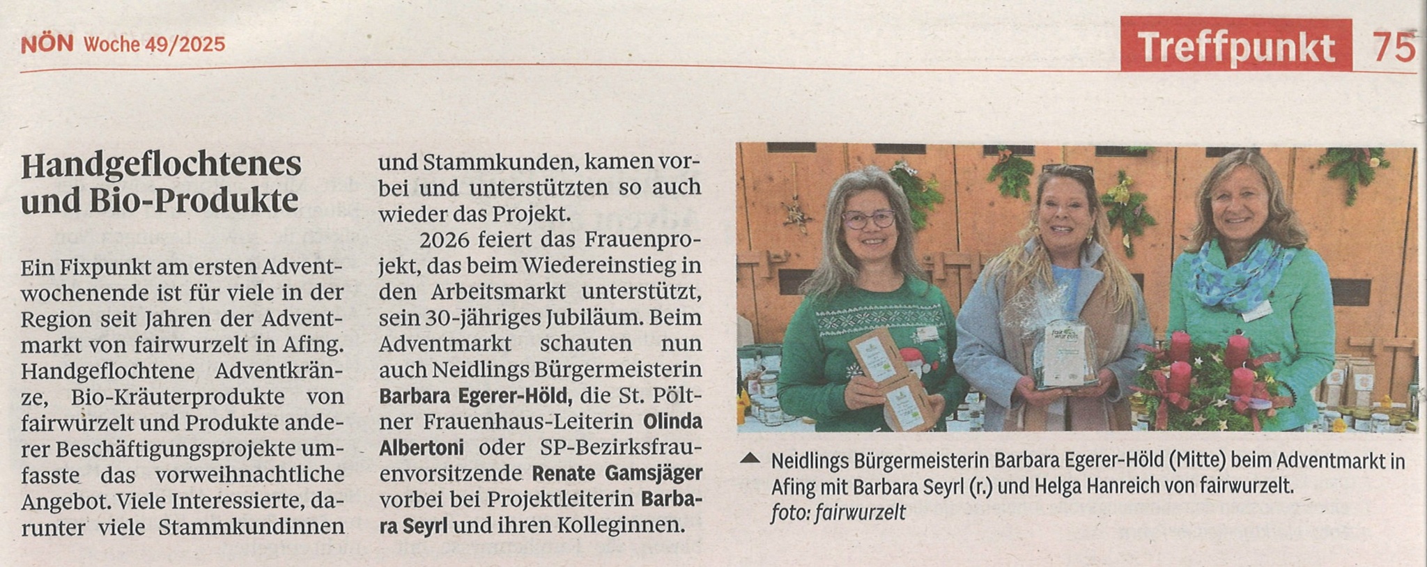 Am 1. Adventwochenende hat wieder der traditionelle Adventmarkt bei fairwurzelt stattgefunden. Die handgeflochtenen Adventkränze, die fairwurzelt Bio-Kräuterprodukte und Produkte anderer Beschäftigungsprojekte fanden großen Anklang.